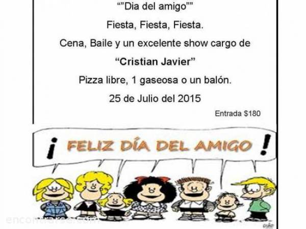 DIA DEL AMIGO!!LLEGA EL MES DE JULIO Y LLEGA EL GRAN FESTEJO, PARA ESO NOS JUNTAMOS DOS BUENAS AMIGAS, LADYDY Y YO, QUEREMOS VERLOS DIVERTIRSE, DISFRUTAR Y BAILAR...EN ESTE DÌA TAN ESPECIAL...DONDE NOS JUNTAREMOS VIEJOS AMIGOS Y TODOS LOS NUEVOS QUE QUIERAN FORMAR PARTE DE ESTA LOCA Y HERMOSA BANDA. LOS ESPERAMOS A TODOSSSSS. EN BREVE VAMOS A IN